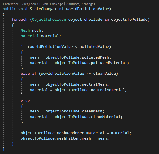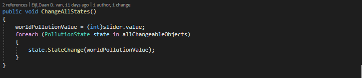 Tot slot worden alle gameobjects die veranderd kunnen worden, aangetast gebaseerd op de worldPollutionValue en de waarde waarbij het object daadwerkelijk moet veranderen. Dit script staat op alle parent objects van de models (denk aan empty parent object "tree").