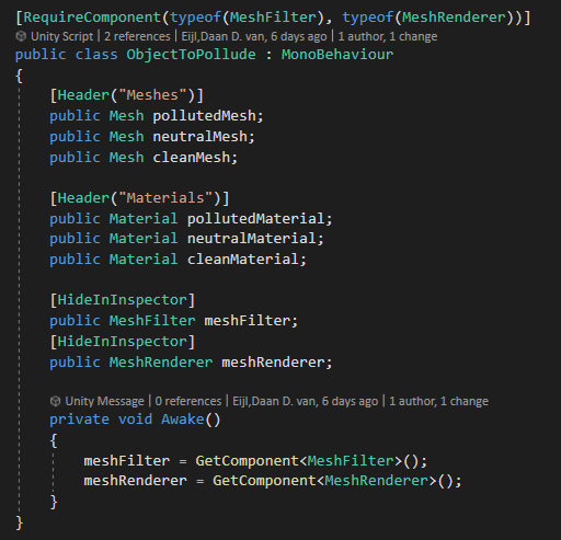 Dit script staat op alle child objects die veranderd kunnen worden (denk aan "leaves" object onder het "tree" object). Zoals te zien zijn de kleuren en meshes aan te passen gebaseerd op of het object polluted, neutral of clean is.